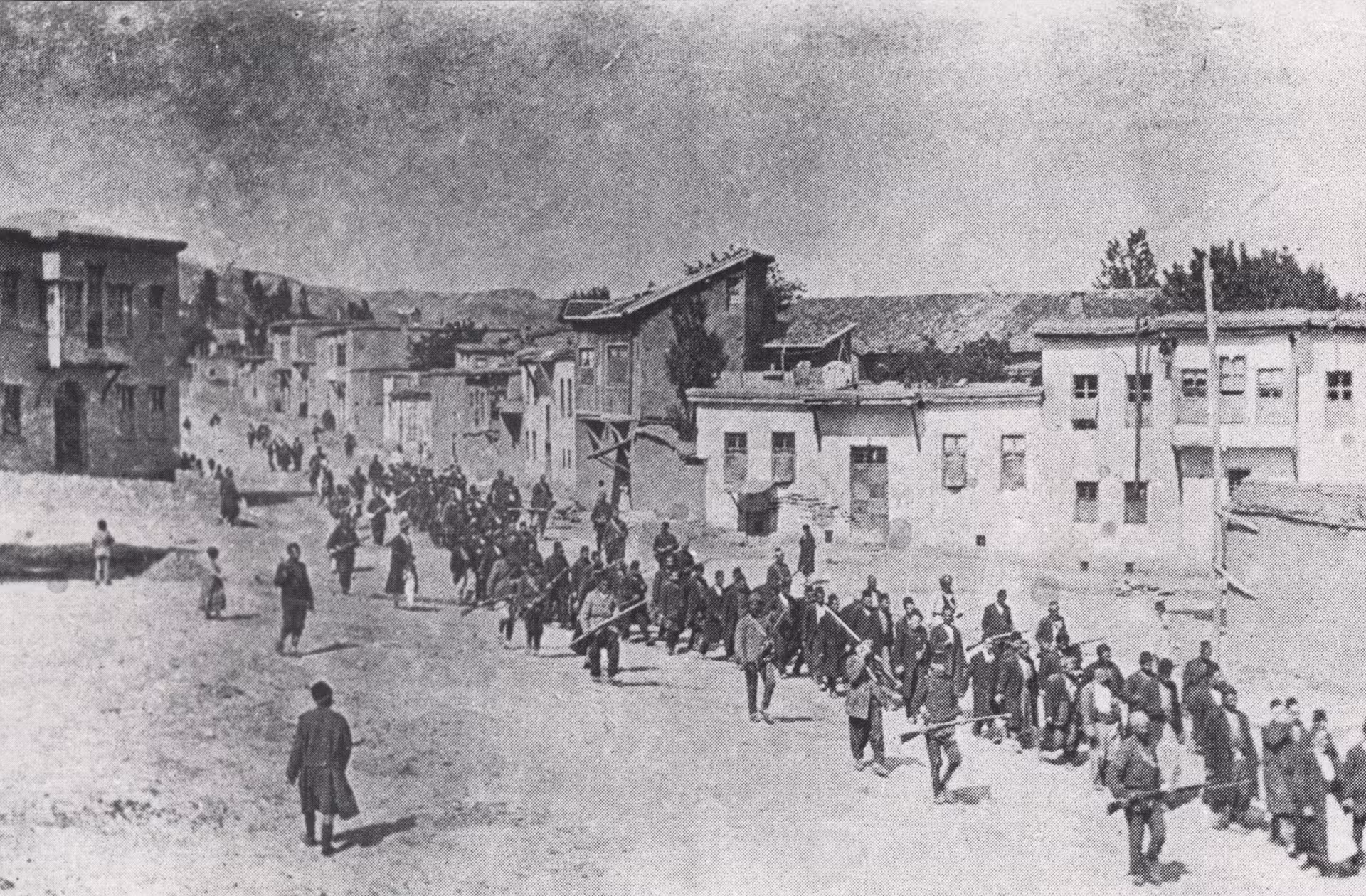 During the Armenian genocide, Armenians being led away by armed guards from Harpoot, where the educated and the influential of the city were selected to be massacred at the nearest suitable site, May 1915.