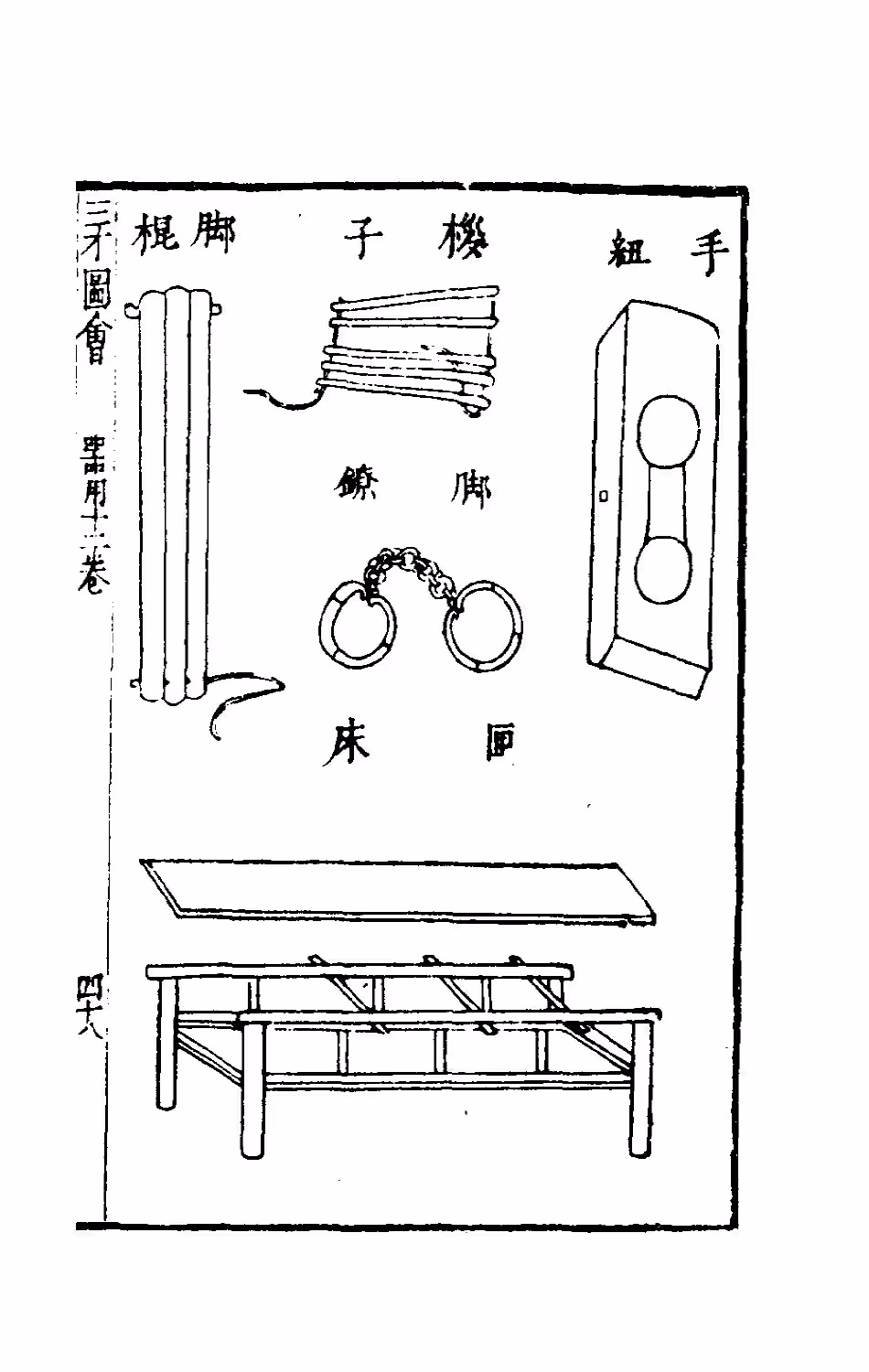 Ancient Chinese torture devices from the 1609 Sancai Tuhui, Clockwise from upper left: ankle press (jiaogun 腳棍), finger press (zanzi 桚子), wooden manacles (shoujiu 手紐), fetters (jiaoliao 腳鐐), and box-bed (xiachuang 匣床)