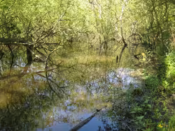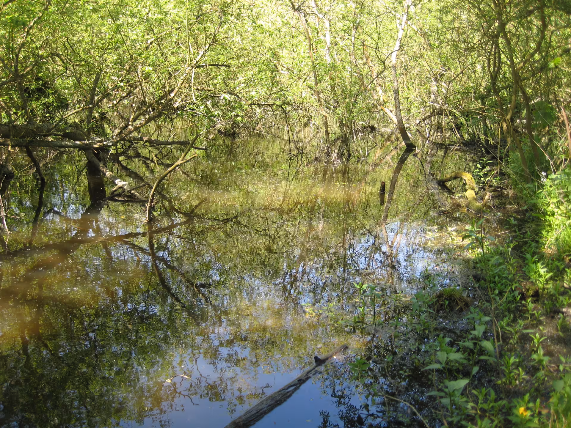 In particular, a marsh or fen formed when the litter of decaying reeds (e.g. in a lake) raises the ground level above the water, allowing more vegetation like sedges and then low bushes or trees to grow; a marshy woodland. (Compare marsh, swamp, bog, fen.)