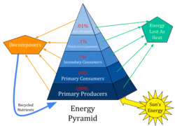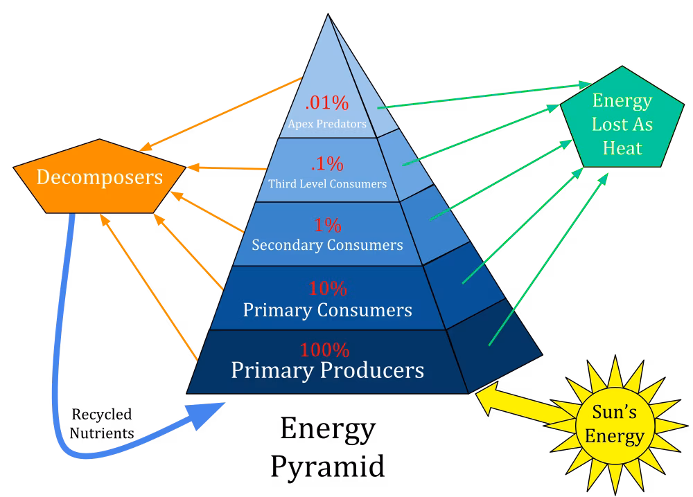 The pyramid of energy represents how much energy, initially from the sun, is retained or stored in the form of new biomass at each trophic level in an ecosystem. Typically, about 10% of the energy is transferred from one trophic level to the next, thus preventing a large number of trophic levels. Energy pyramids are necessarily upright in healthy ecosystems, that is, there must always be more energy available at a given level of the pyramid to support the energy and biomass requirement of the next trophic level.