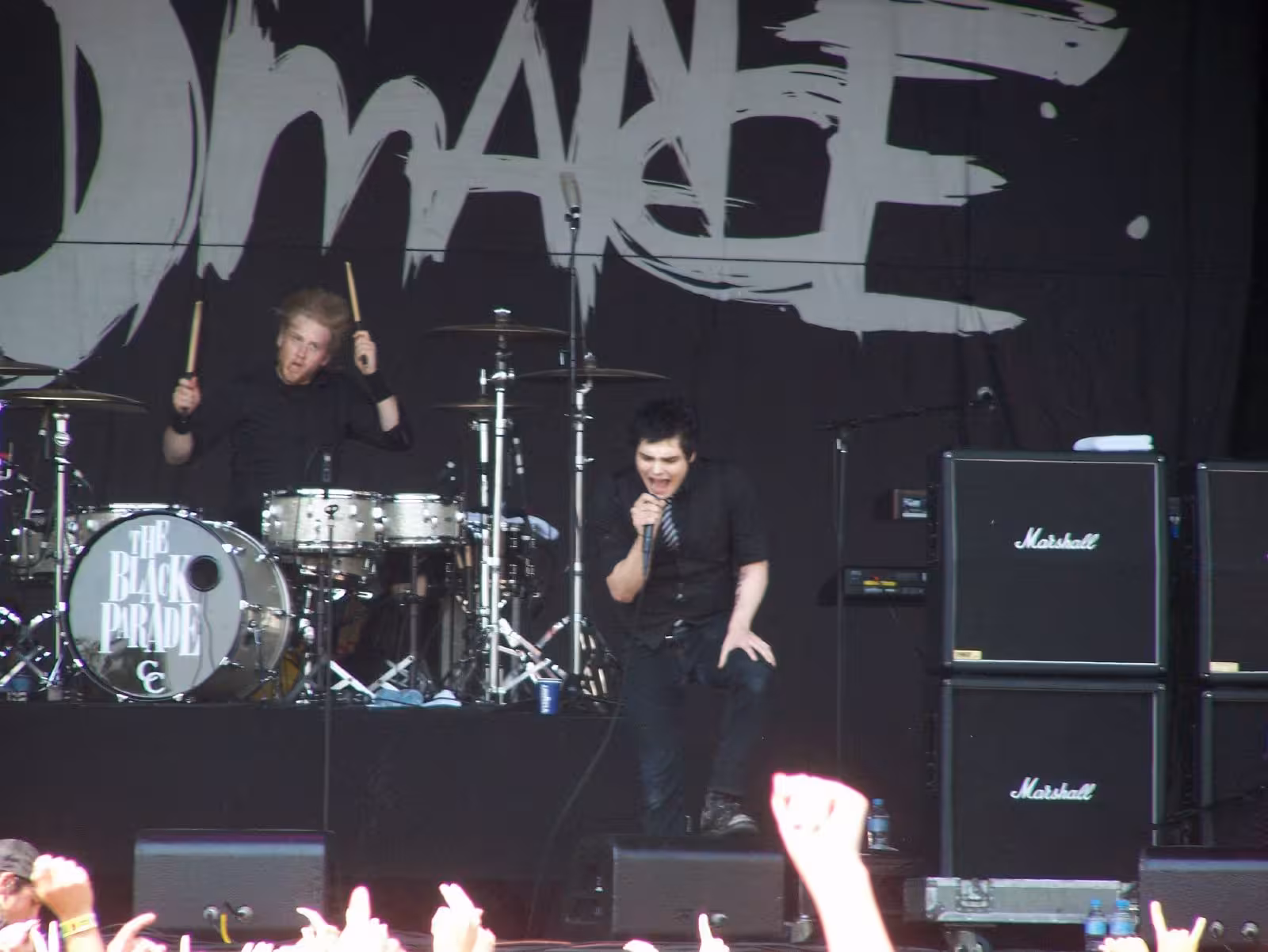 My Chemical Romance is known for their use of eyeliner and black clothing associated with emo fashion.