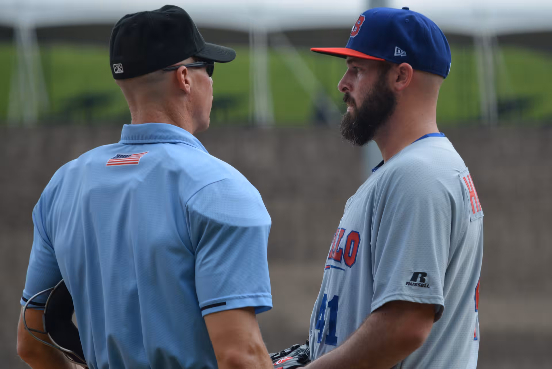 Mike Hauschild (right) talks to an umpire after having been called for a balk