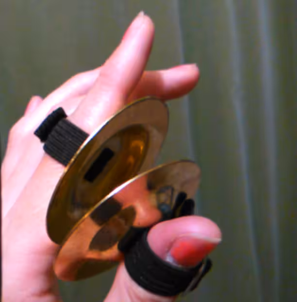 A close-up of a person holding zills (traditionally, it would be held on the middle finger instead of the pointer, and above the last knuckle)