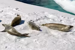 A group of crabeater seals relaxing on an iceberg. These pinnipeds are planktivores and feed primarily on krill.