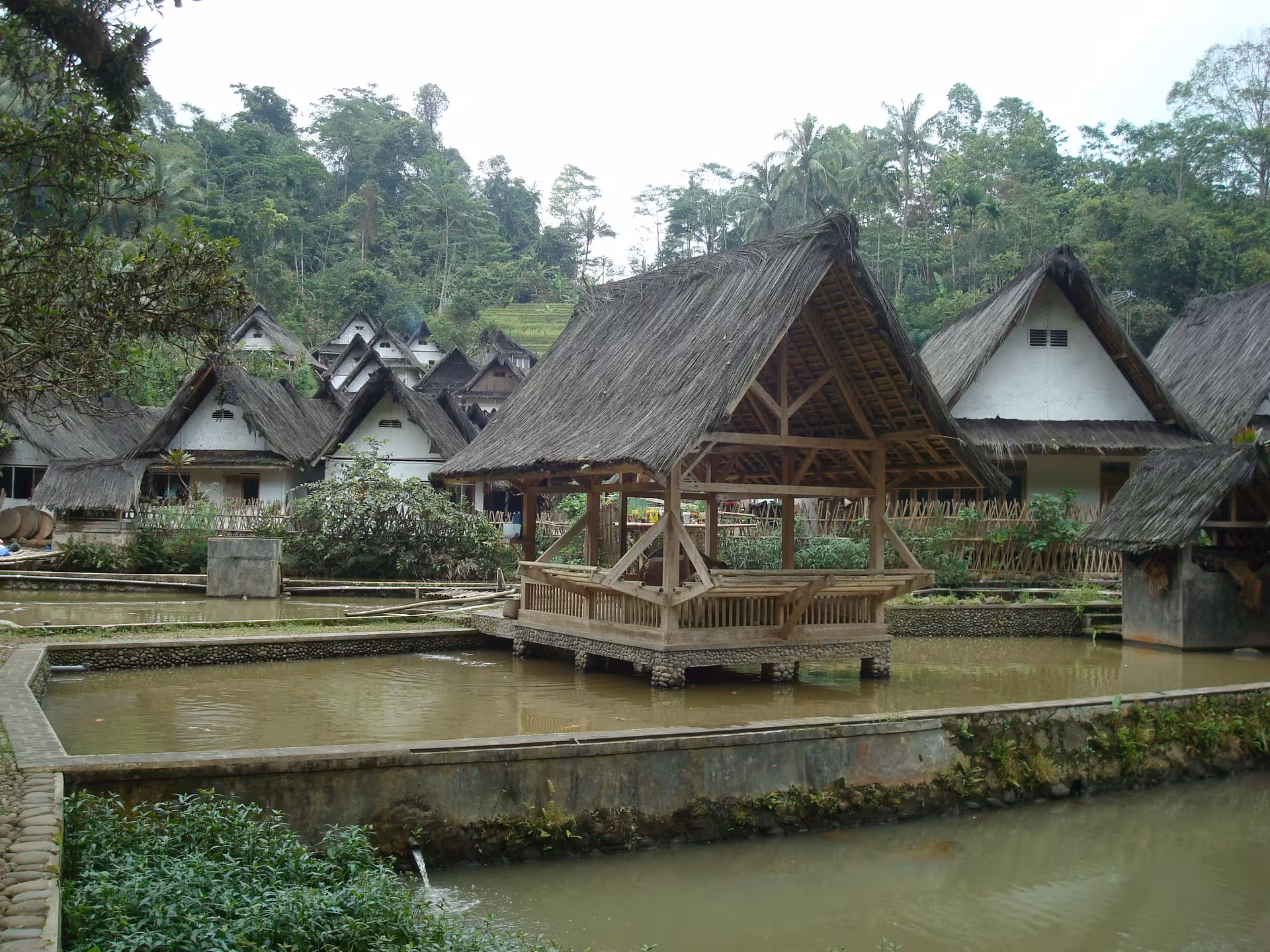 Traditional houses and pond pavilion of Kampung Naga, a traditional Sundanese village in West Java, Indonesia.