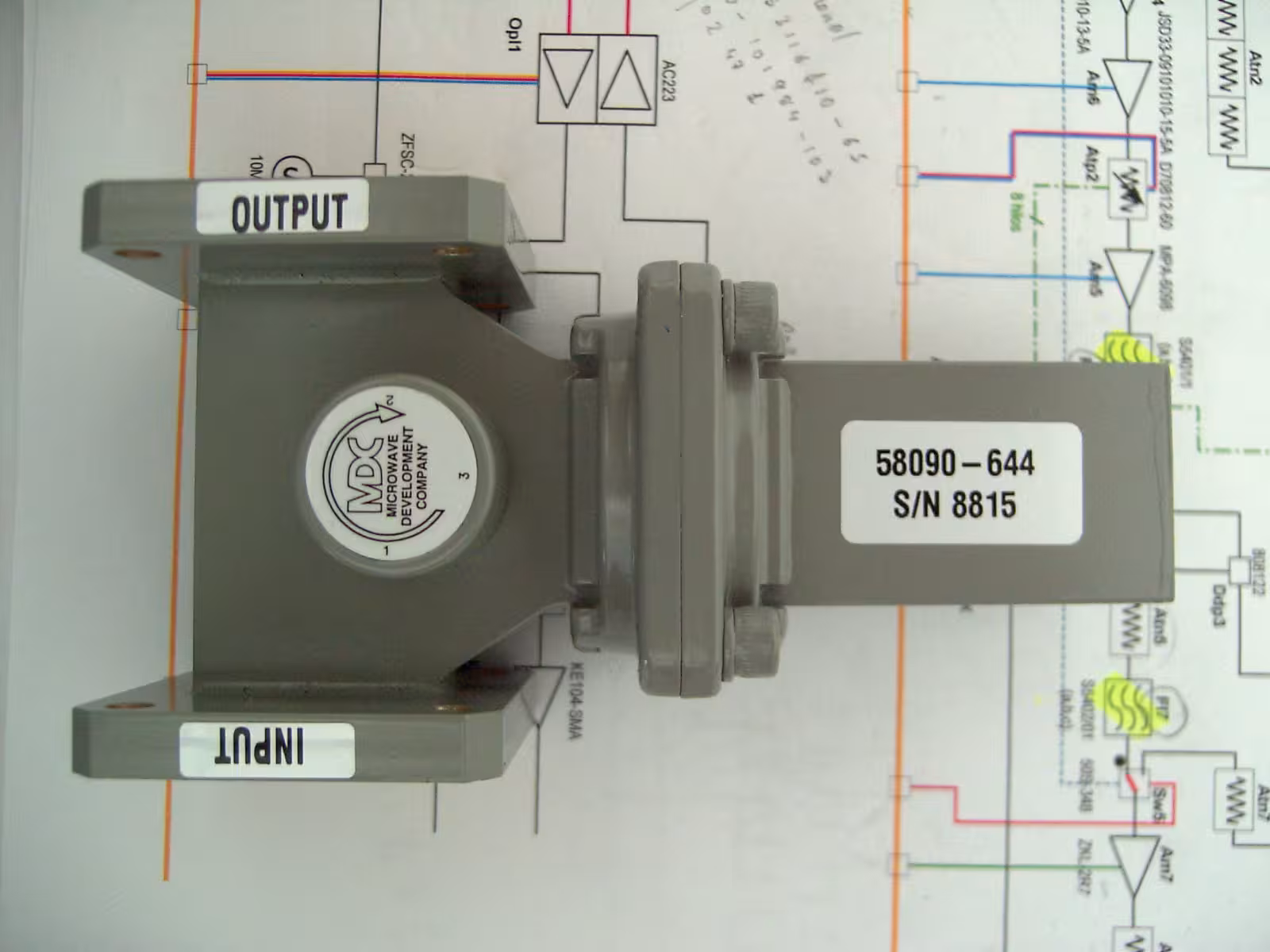 A waveguide junction circulator used as an isolator by placing a matched load on port 3. The label on the permanent magnet indicates the direction of circulation.