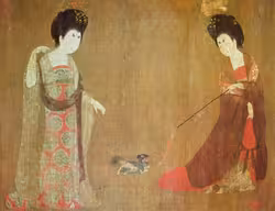 Two women playing with a lap dog, China, 8th century, Beauties Wearing Flowers by Tang dynasty painter Zhou Fang