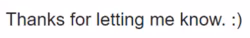 An example of an emoticon smiley face (represented using a colon followed by a parenthesis) used in direct communication, as seen in this screenshot of an email