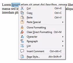 A context menu from LibreOffice Writer, appearing when the user right-clicks on a page element