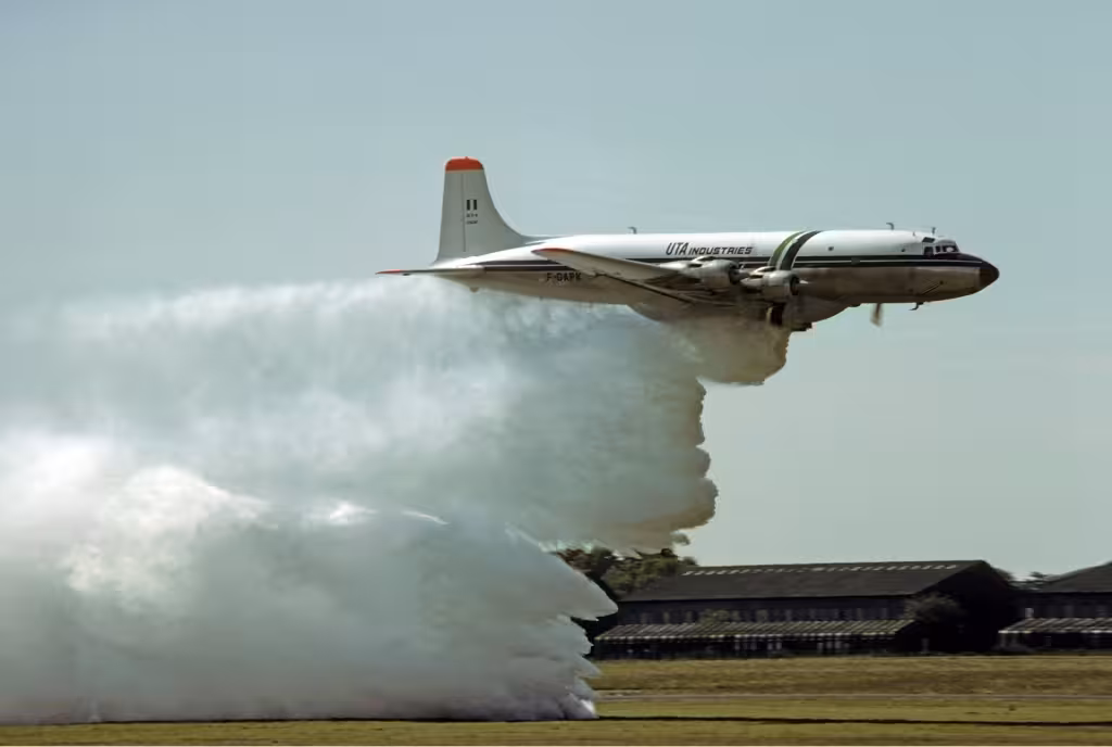 A DC-10 operated by 10 Tanker Air Carrier for the U.S. Forest Service demonstrates a water drop during "Thunder Over The Empire Air Fest" at March Air Reserve Base, Calif. (2012)