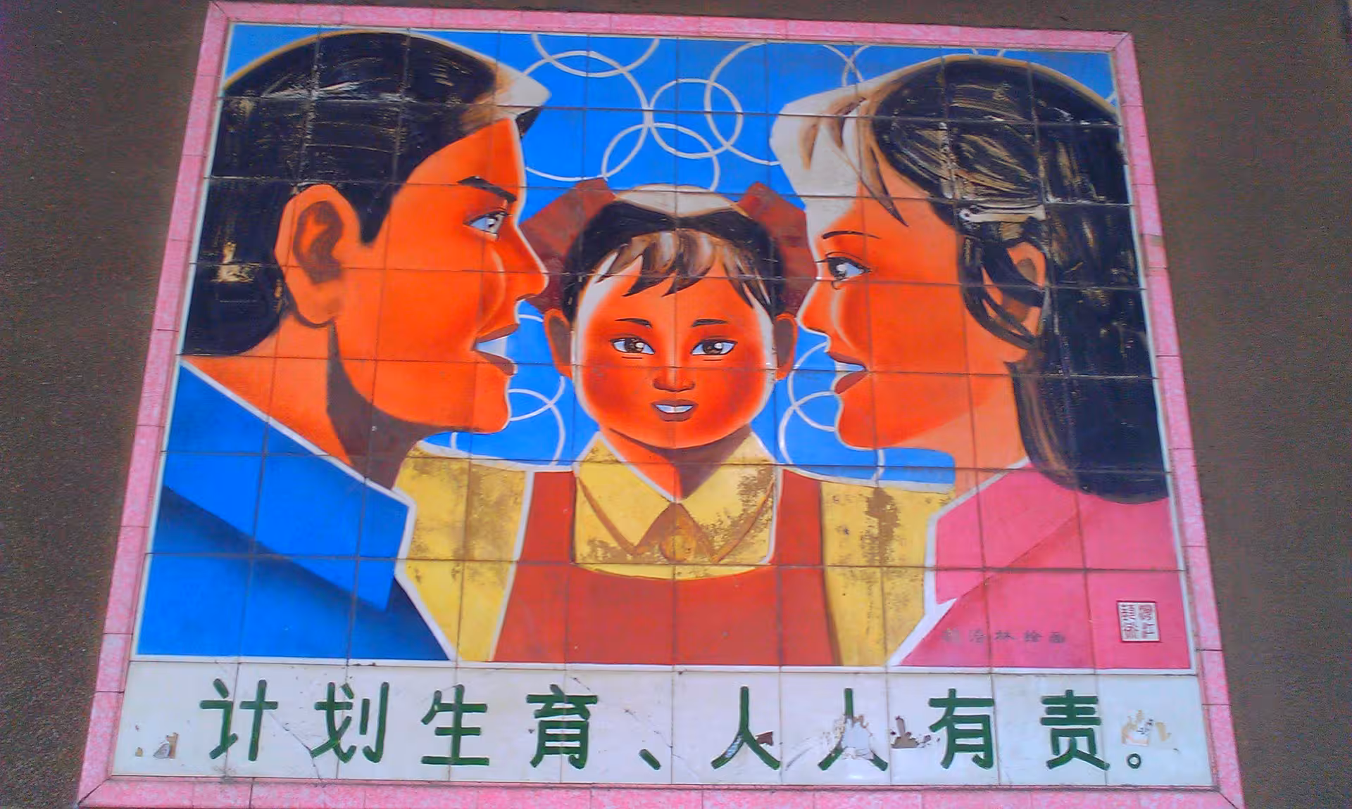 A propaganda painting in Guangdong promotes the idea of a nuclear family with a single child. The text reads "Planned child birth is everyone's responsibility."