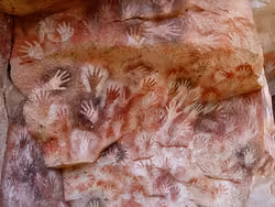 Stenciled hands at the Cueva de las Manos in Argentina. Left hands make up over 90% of the artwork, demonstrating the prevalence of right-handedness.