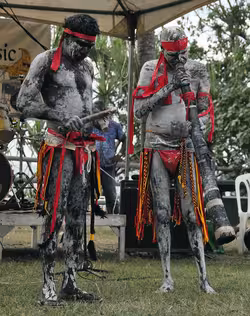 Didgeridoo and clapstick players performing at Nightcliff, Northern Territory