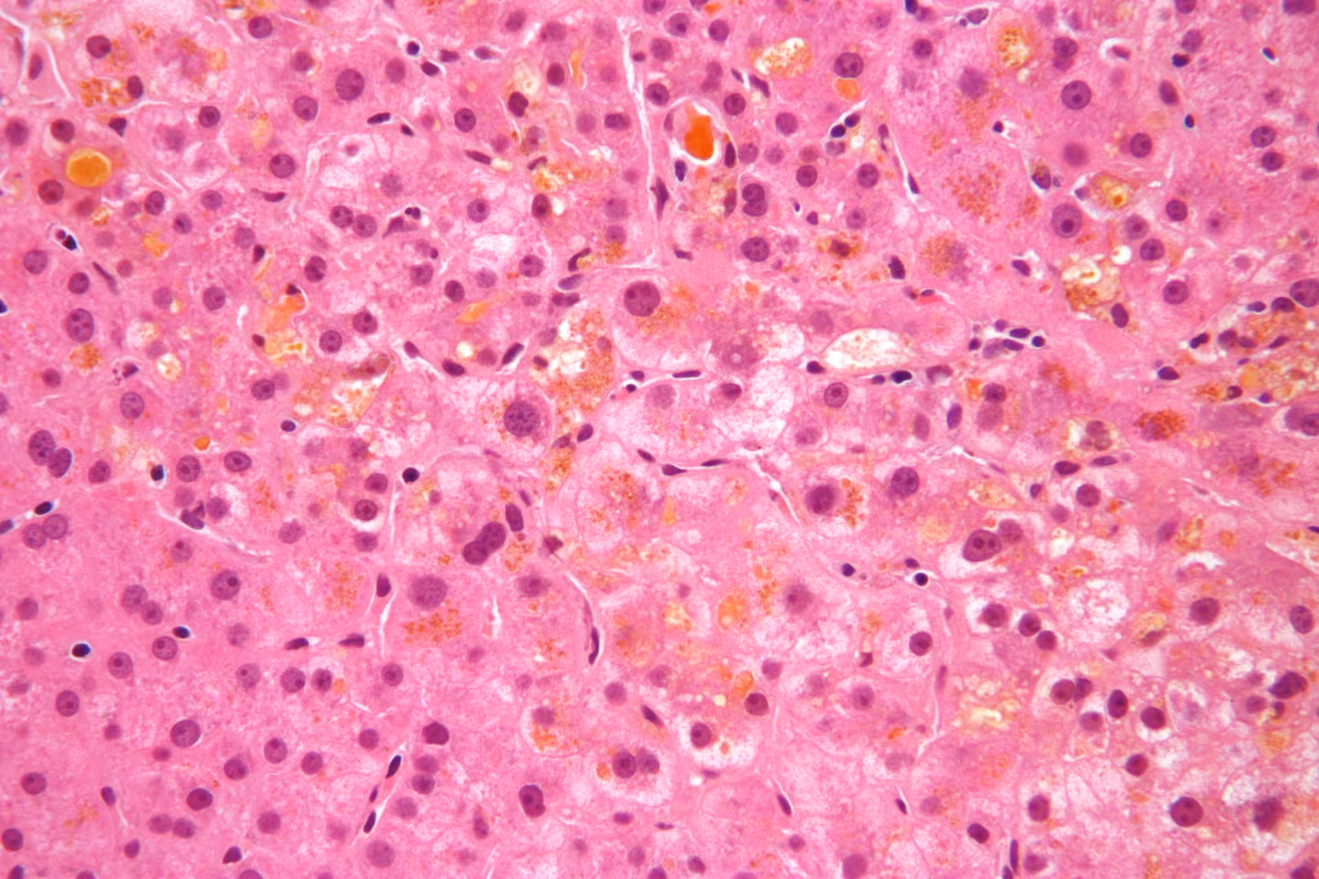 Micrograph showing bile (yellow) stasis in liver tissue, i.e. cholestasis. H&E stain.