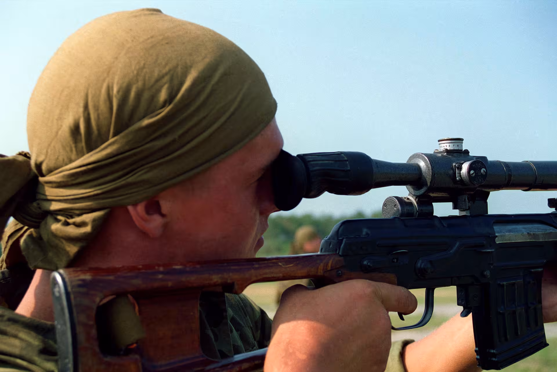 A Kazakh soldier using a sniper rifle in a counter-sniping exercise