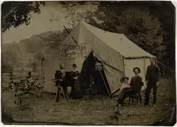 Studio tent of ferrotypist J. Q. Galusha, 12,7 × 17,7 cm, USA, c. 1880–1900