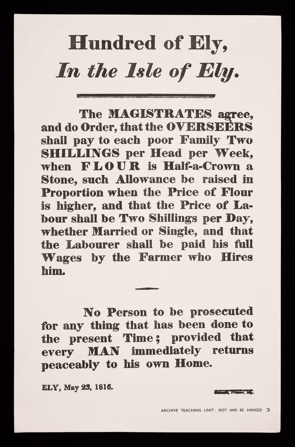 An example of British magistrates' wide-ranging and high powers – a proclamation made to quell rioters in Ely, 1816