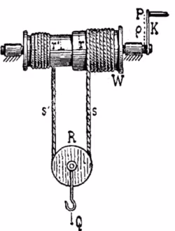 Any of various forms of winch, in which a rope or cable is wound around a cylinder, used for lifting heavy weights