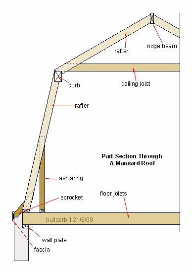 A cross-sectional diagram of a timber-framed Mansard roof; each of its four faces has the same profile.