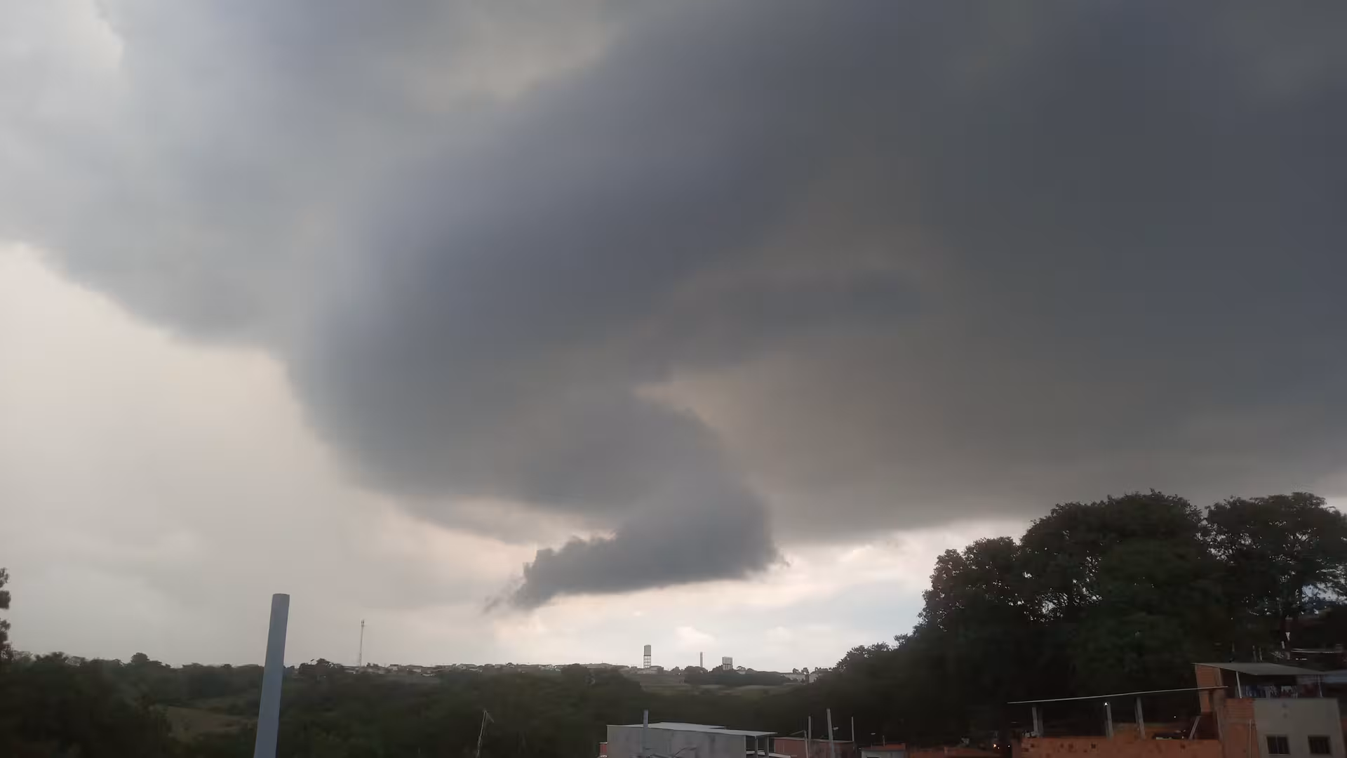 Supercell in Piracicaba, southeastern Brazil, on June 27, 2025, featuring a mesocyclone, a tail cloud, and a developing downdraft/rain curtain on the left.