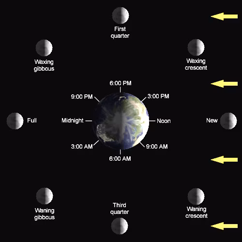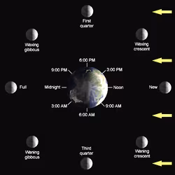 The time of day at a location on Earth (except at the poles) can be inferred from the culmination of the Moon in the sky and its phase: each lunar phase culminates closest to the zenith (being exactly south or north of it, crossing the meridian) in the sky at a specific daytime, as marked in the diagram, rising (east) and setting (west) during the time of the day preceding and succeeding the culmination.