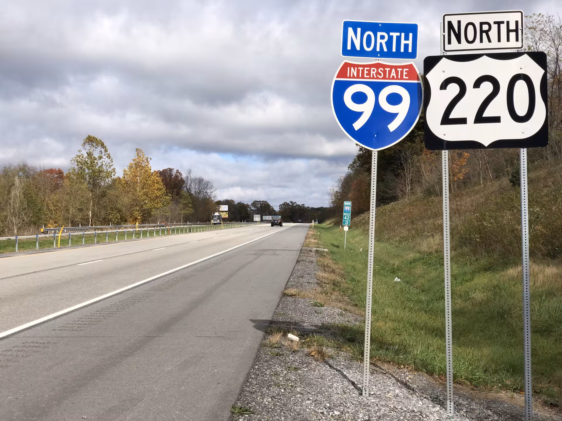 Highway shields on a two-way concurrency, where I-99 and US 220 share one roadway traveling northbound in Antis Township, Blair County, Pennsylvania
