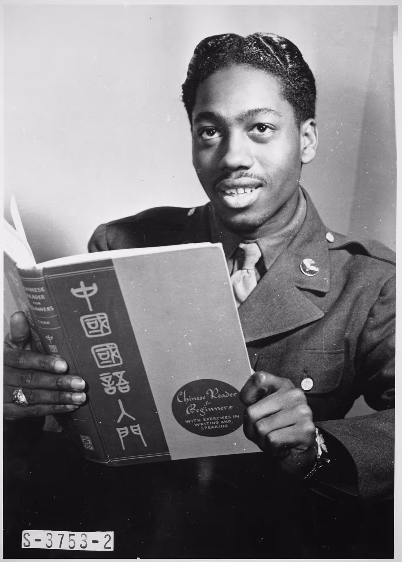 "Pvt. Lloyd A. Taylor, 21-year-old transportation dispatcher at Mitchel Field, New York City, who knows Latin, Greek, Spanish, French, German, and Japanese, studies a book on Chinese. A former medical student at Temple University, he passes two hours a day studying languages as a hobby." This picture was taken during World War II.