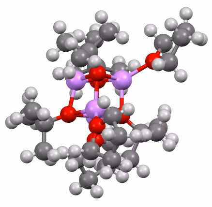 Structure of the Li4(OBu-t)4(thf)3 cluster, highlighting the tendency of alkoxides to aggregate and bind ether ligands. Carbon (C) Lithium (Li) Oxygen (O) Hydrogen (H)