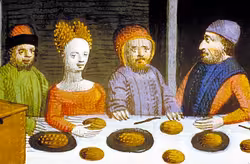 (chiefly historical) A porridge made by boiling hulled wheat, typically with additional ingredients such as milk, egg yolks, and/or almond milk, traditionally served with venison or porpoise.