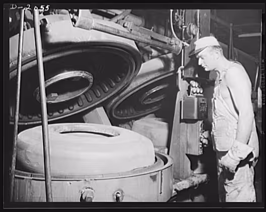 Worker placing a tire in a mold before vulcanisation