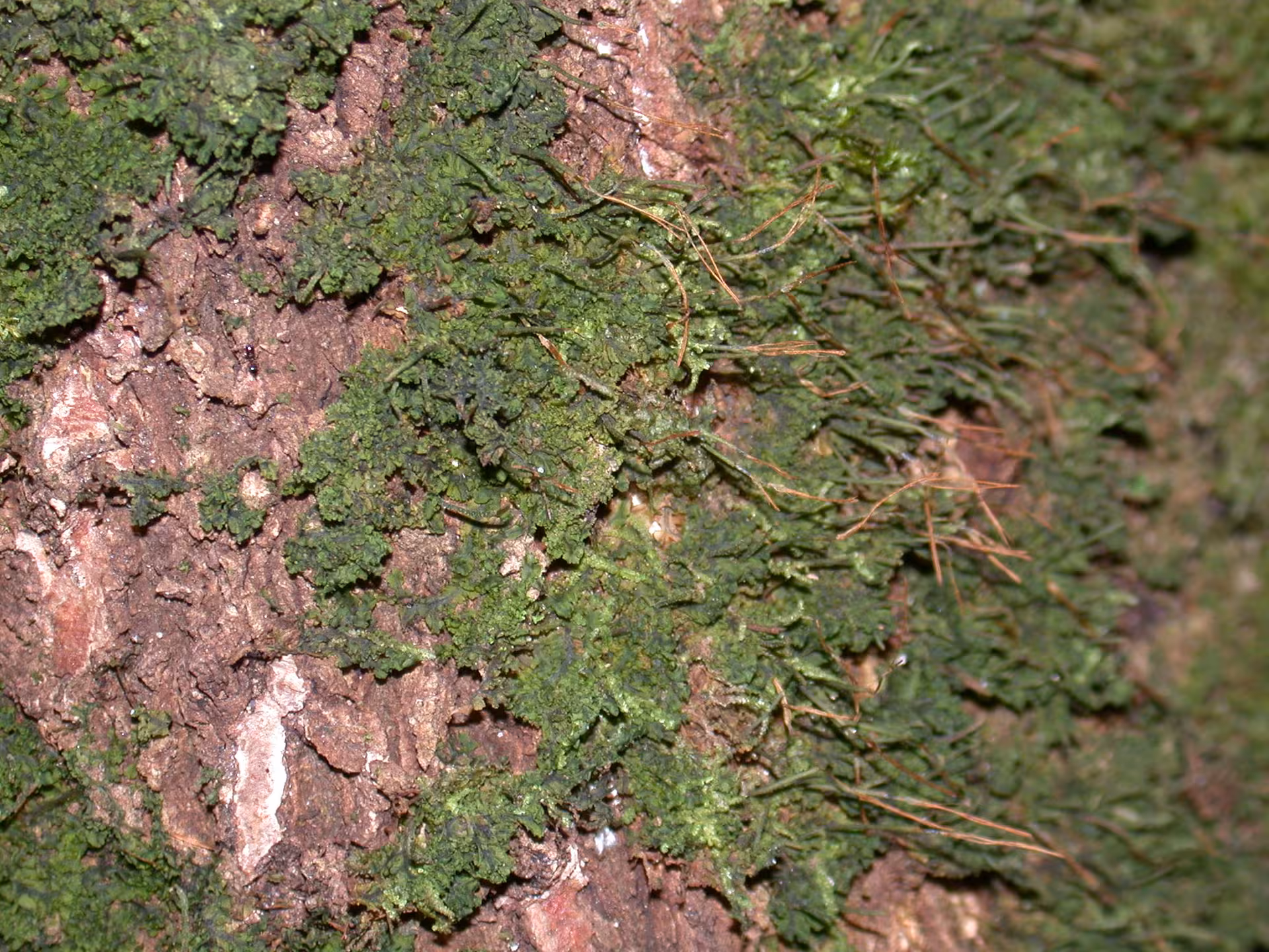 The hornwort Dendroceros crispus growing on the bark of a tree.