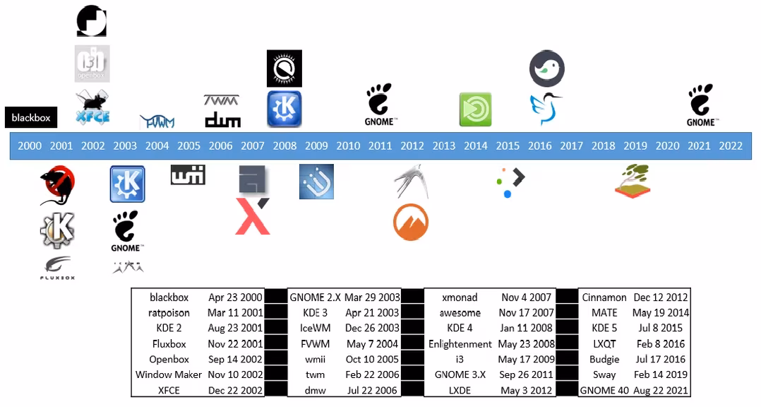 A brief timeline of the most popular modern desktop environments for Unix-like operating systems (greyscale logos indicate when the project's development started, while colorized logos indicate the project's first official release)