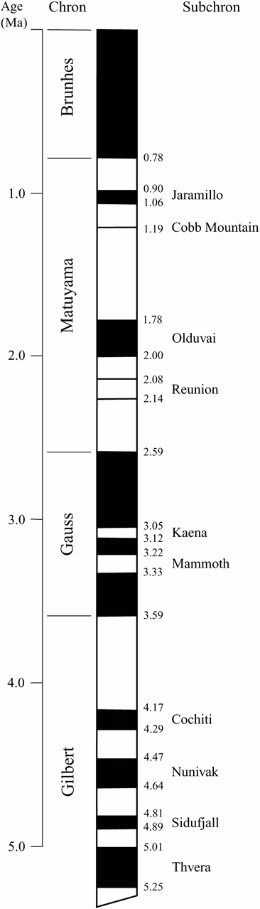Magnetic stripes are the result of reversals of the Earth's field and seafloor spreading. New oceanic crust is magnetized as it forms and then it moves away from the ridge in both directions. The models show a ridge (a) about 5 million years ago (b) about 2 million years ago and (c) in the present.