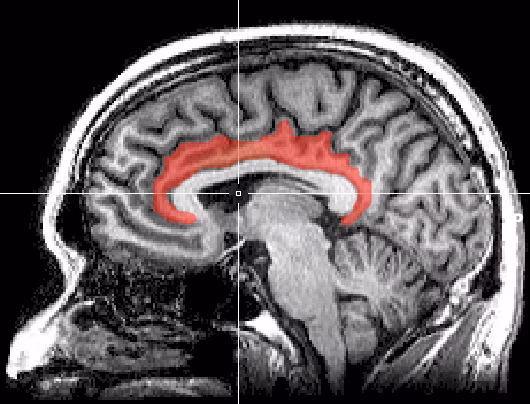 Sagittal MRI slice with highlighting indicating location of the cingulate cortex.