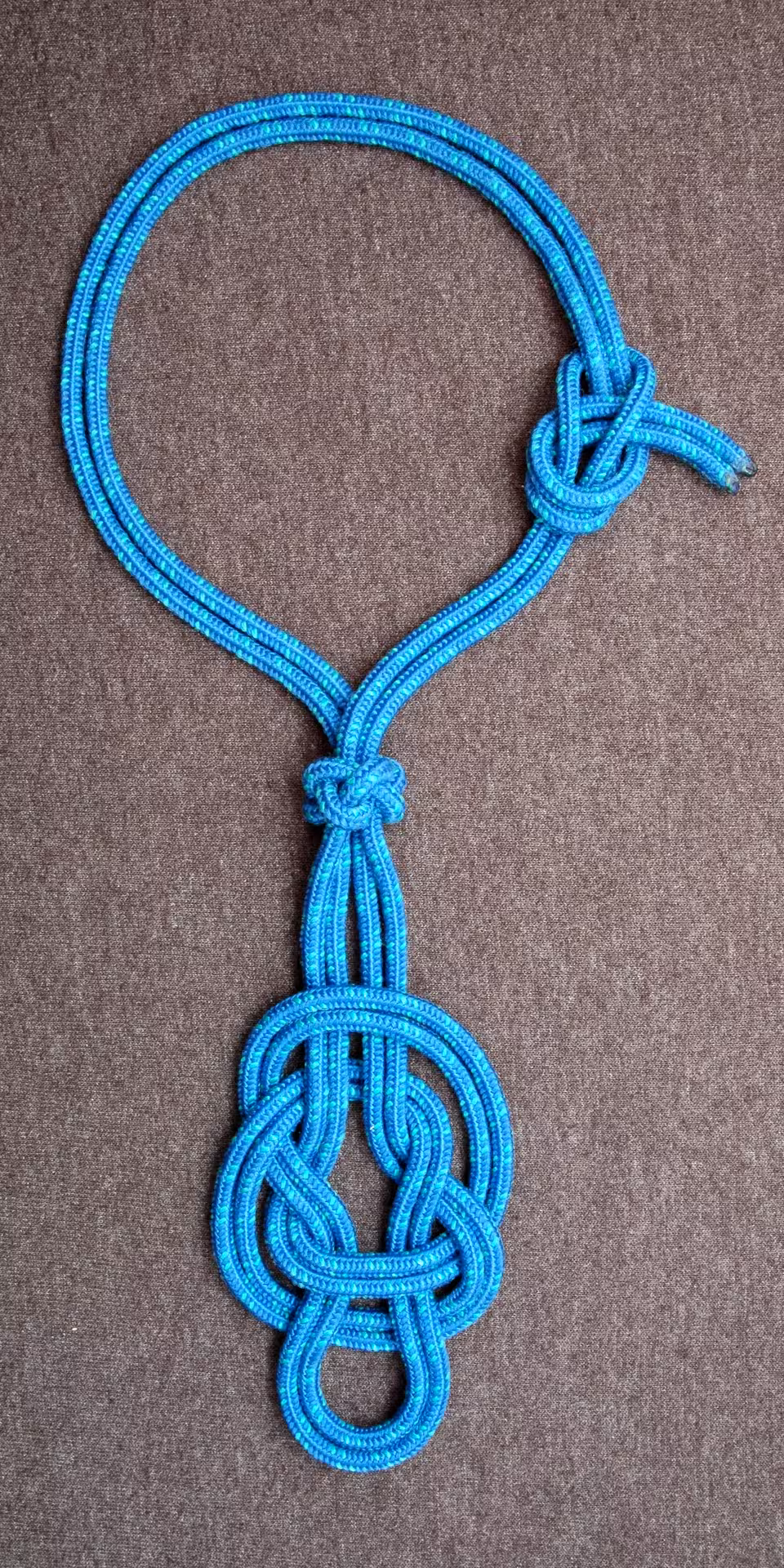 A knot that can be used to create a handle for a glass or ceramic container with a slippery narrow neck.