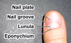 (anatomy) Something shaped like a crescent or half-moon; especially the pale area at the base of the fingernail.