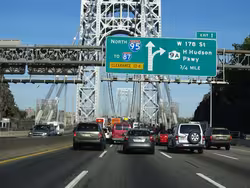 Crossing from Fort Lee, Bergen County, New Jersey, into Manhattan, New York in heavy automobile traffic on the George Washington Bridge, the world's busiest motor vehicle bridge, transporting approximately 300,000 cars and trucks daily across the Hudson River.