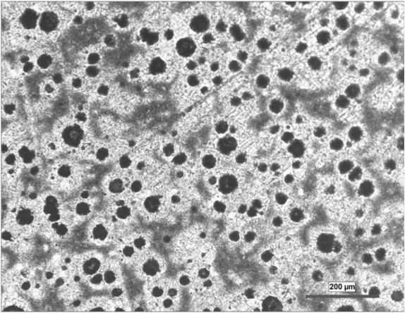 Etched and polished ductile iron microstructure at 100× magnification, showing carbon islanding effect around nodules.