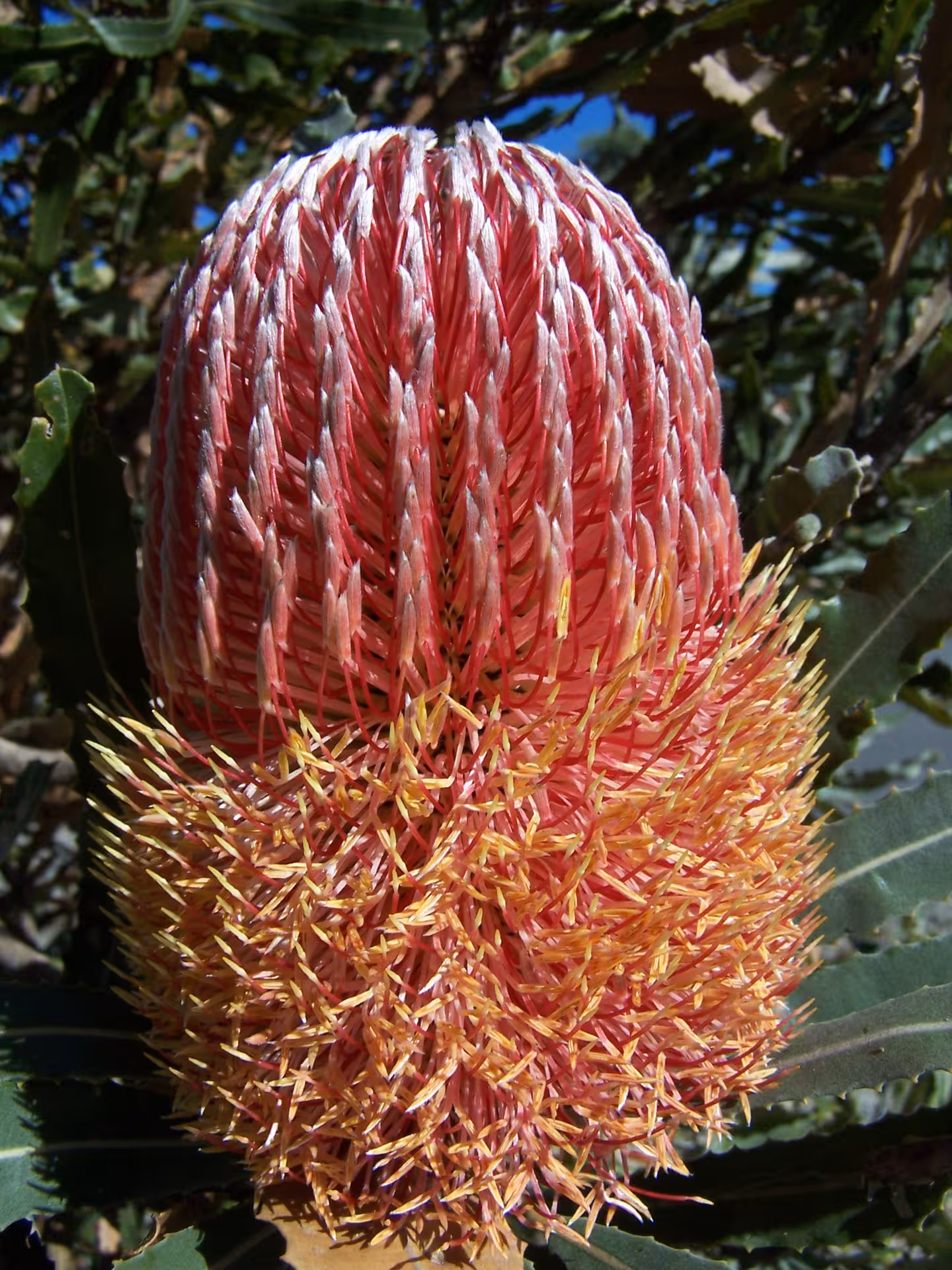 The sequential anthesis of the individual flowers in this Banksia menziesii inflorescence has begun.