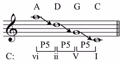 (music) a chord progression with ascending fourths and/or descending fifths.
