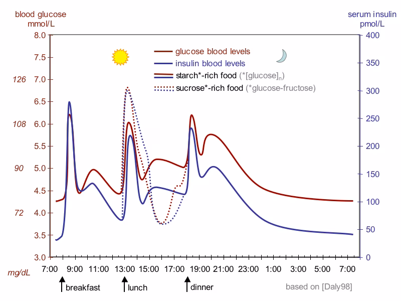 The fluctuation of blood sugar (red) and the sugar-lowering hormone insulin (blue) in humans during the course of a day with three meals. One of the effects of a sugar-rich vs a starch-rich meal is highlighted.