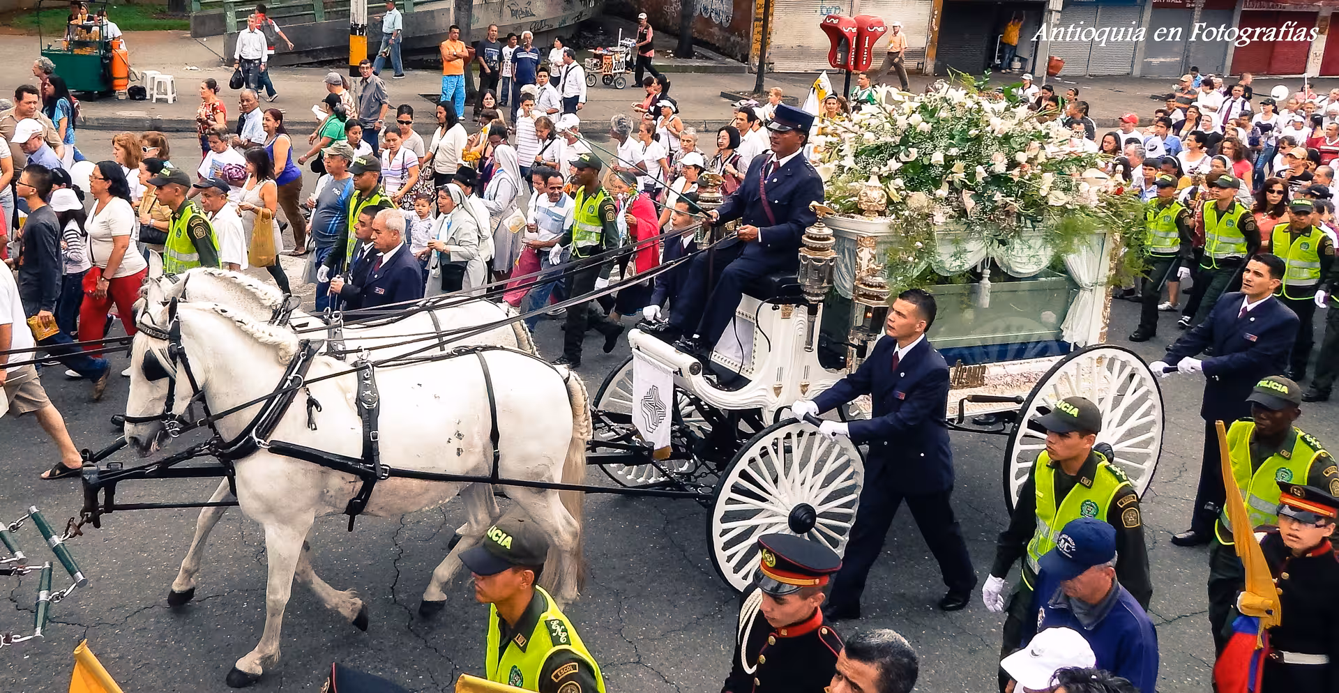 Carroza de la Funeraria San Vicente, transportando los restos mortales de Santa Laura hacia la Catedral Metropolitana de Medellín.