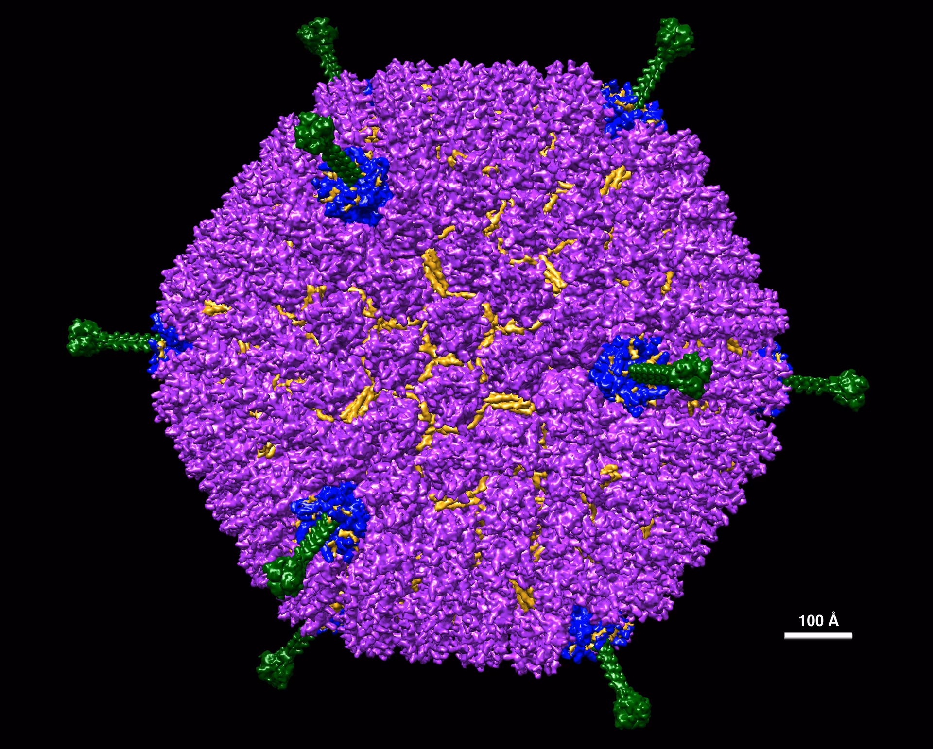 The structure of adenovirus. 1 = penton capsomers, 2 = hexon capsomers, and 3= viral genome (linear dsDNA)