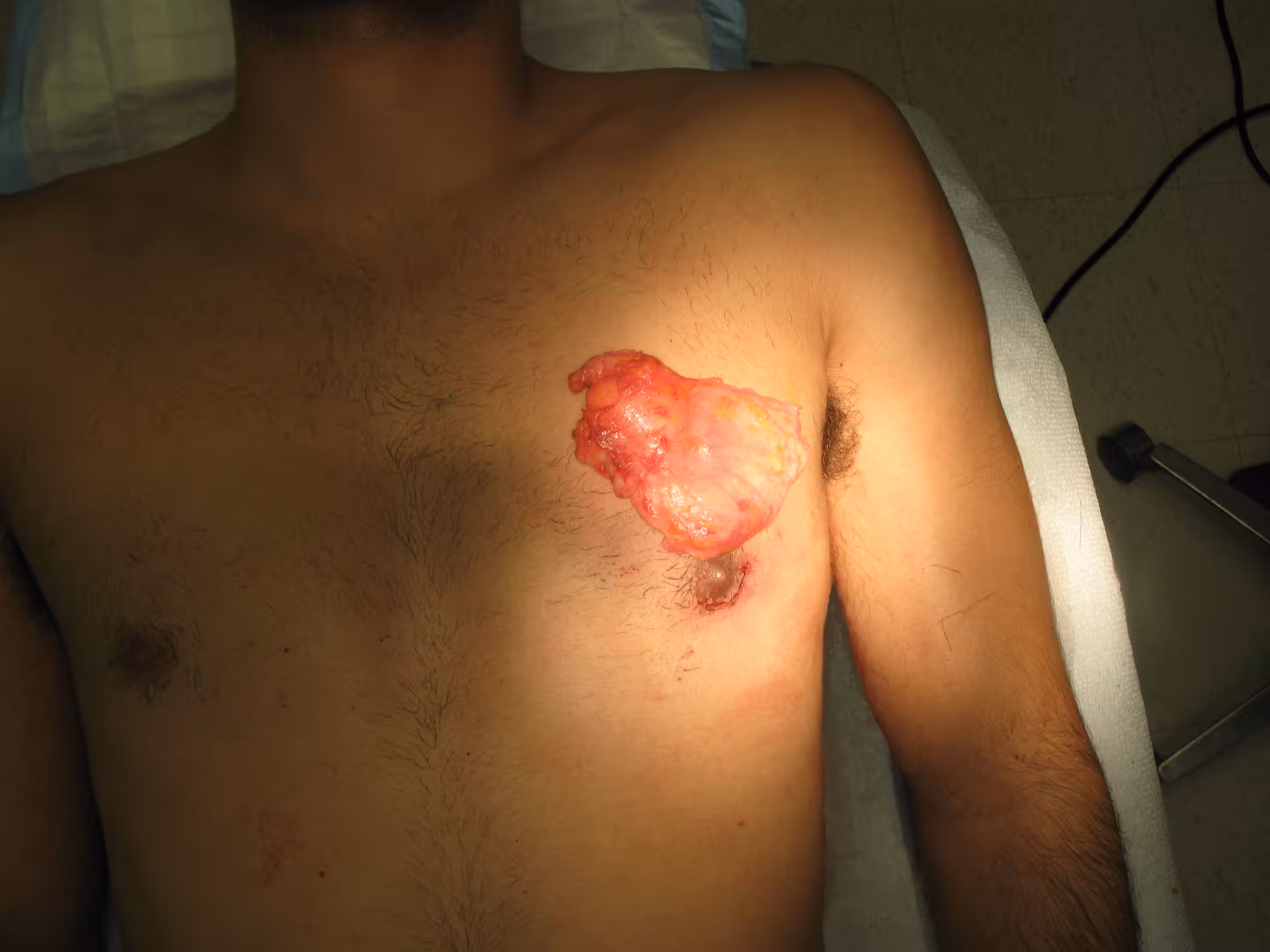 Pathology: A large glandular mass of male breast tissue, surgically removed