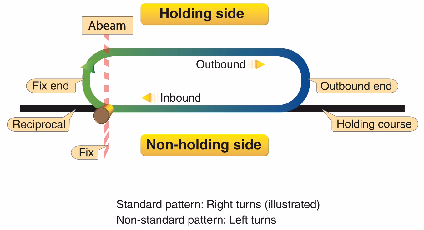 A standard holding pattern. Shown are the entry (green), the holding fix (red) and the holding pattern itself (blue)
