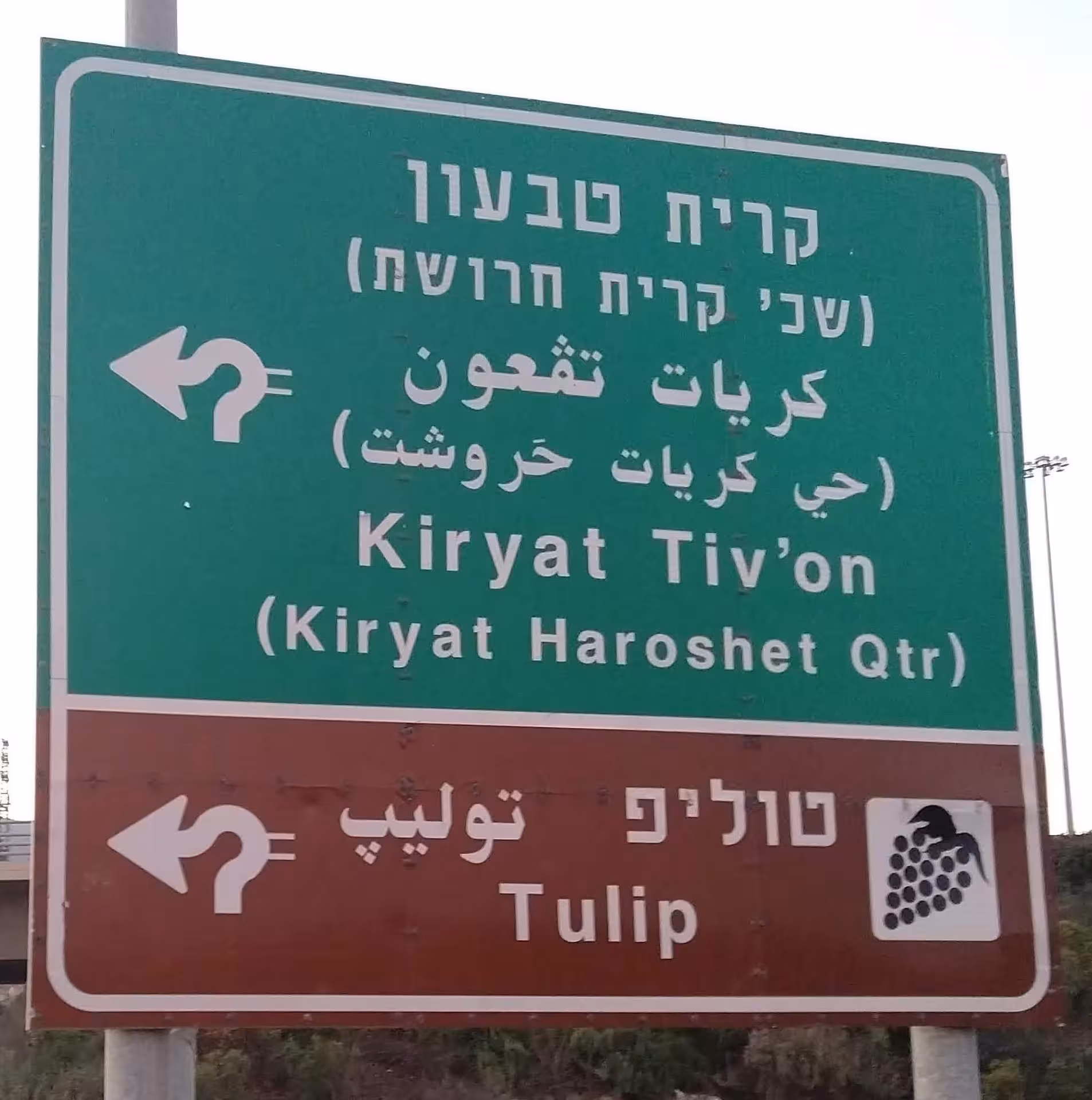 A trilingual road sign in Israel transliterates the final consonant from a winery with the English name "Tulip" into Arabic and Hebrew using non-native letters: پ in Arabic and the non-final form of פ in Hebrew.