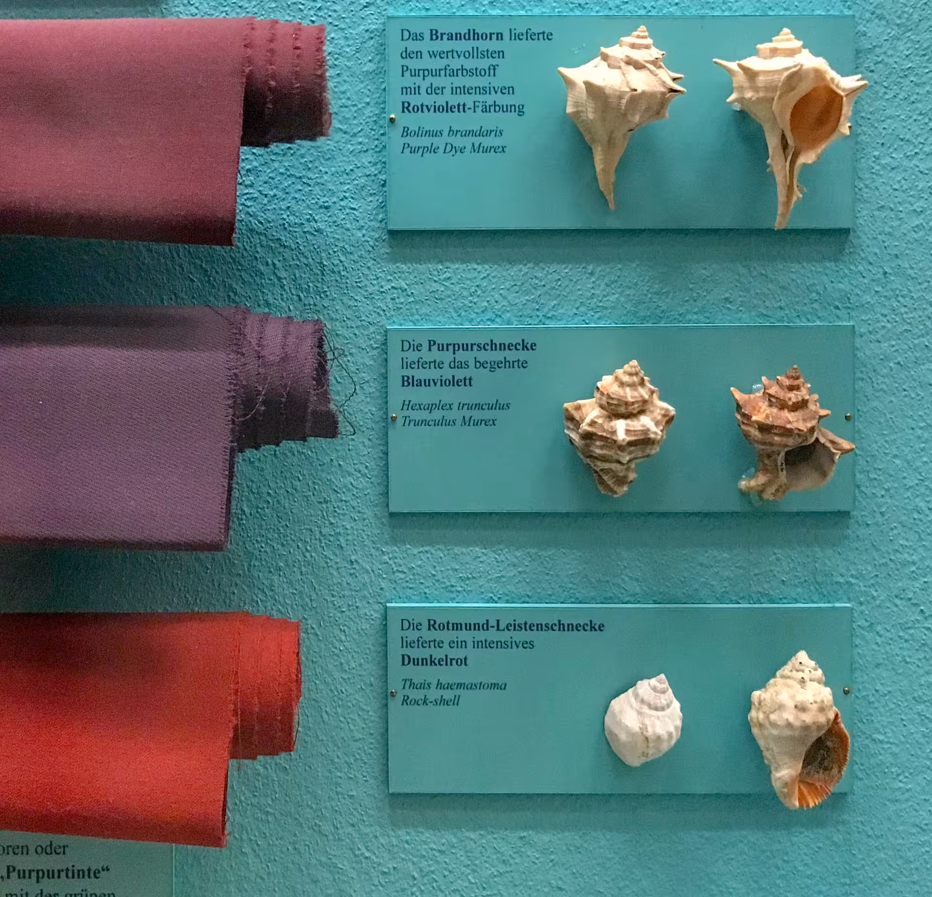 Fabrics dyed in the current era from different species of sea snail. The colours in this photograph may not represent them precisely.