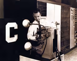 The Mark 1 Perceptron, being adjusted by Charles Wightman (Mark I Perceptron project engineer). Sensory units at left, association units in center, and control panel and response units at far right. The sensory-to-association plugboard is behind the closed panel to the right of the operator. The letter "C" on the front panel is a display of the current state of the sensory input.