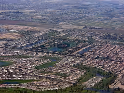 (urban studies) An unplanned, disorganized growth of housing etc. on the edge of a city.