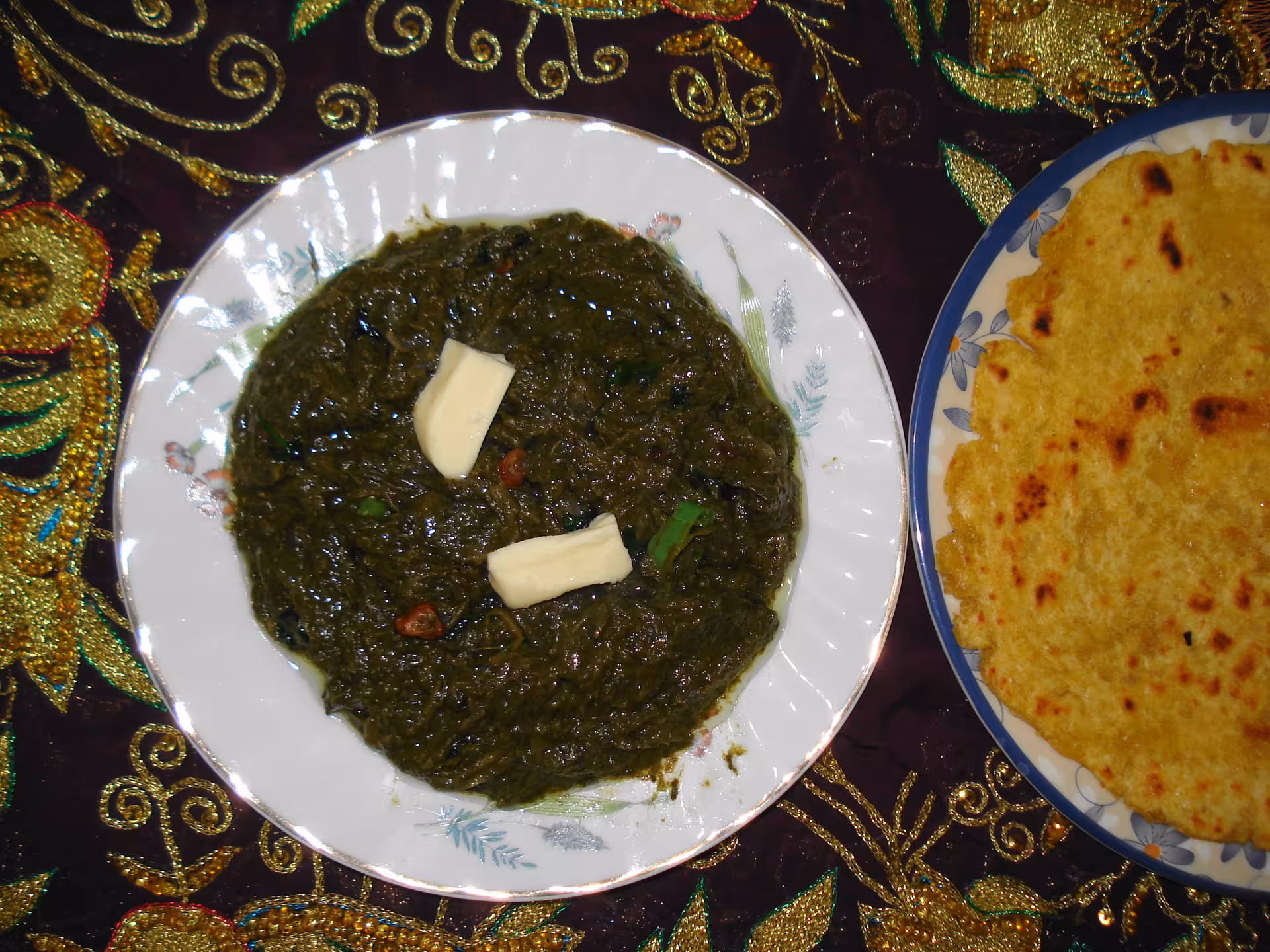 An Indian dish made from greens (usually spinach) cooked down to a thick paste.